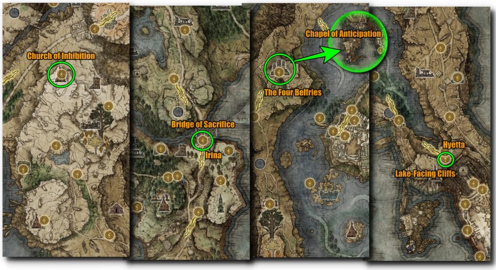 • Church of Inhibition: Located at the top of the Frenzied Flame Village. In the church lies a dead Finger Maiden, but you have to defeat the NPC invader Festering Fingerprint Vyke to gain access.